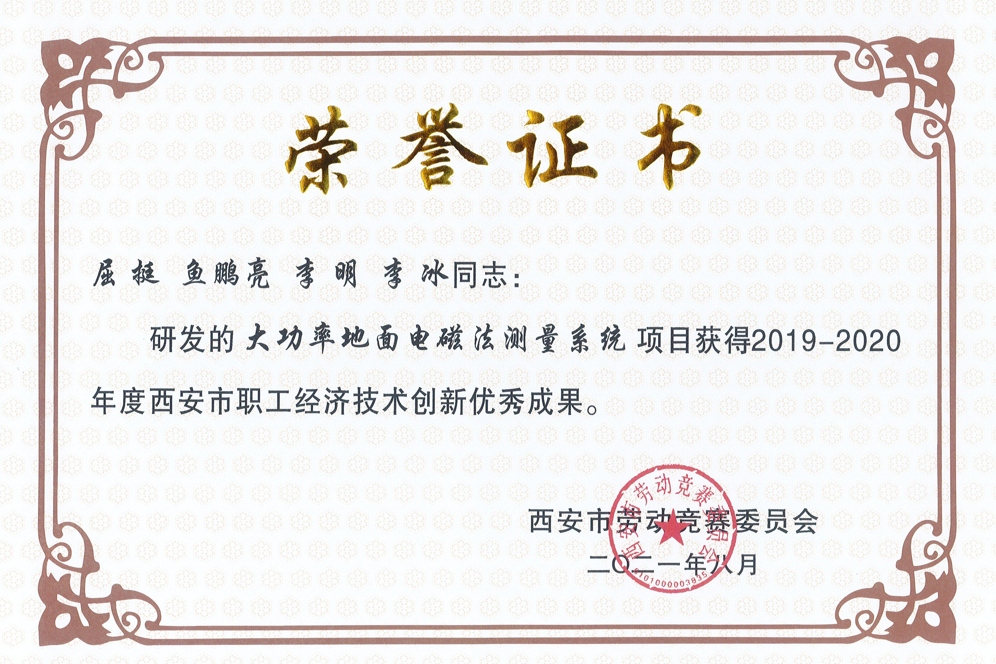 ??? 近日,從西安市勞動競賽委員會傳來喜訊,物化探隊有限公司由主任工程師屈挺牽頭,魚鵬亮、李明、李冰等共同聯(lián)合研發(fā)的“大功率地面電磁法測量系統(tǒng)”項目,榮獲“2020年西安市職工經(jīng)濟(jì)技術(shù)創(chuàng)新優(yōu)秀成果”稱號,工程師楊帥榮獲“2020年西安市勞動競賽先進(jìn)個人”稱號。